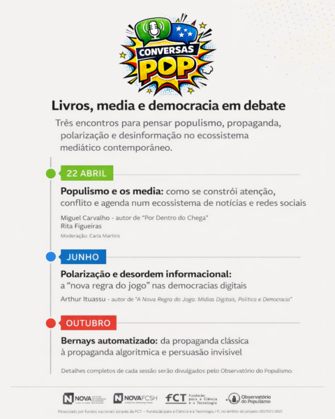 O Observatório do Populismo para o Século XXI promove, ao longo de 2026, o ciclo Conversas Pop, um conjunto de debates que propõe discutir a expansão dos populismos contemporâneos a partir de obras recentemente publicadas em Portugal e no Brasil. A iniciativa procura analisar criticamente a forma como populismo, propaganda, polarização e desinformação se articulam num ambiente mediático híbrido, marcado pela crescente intermediação de plataformas digitais e sistemas de recomendação algorítmica.